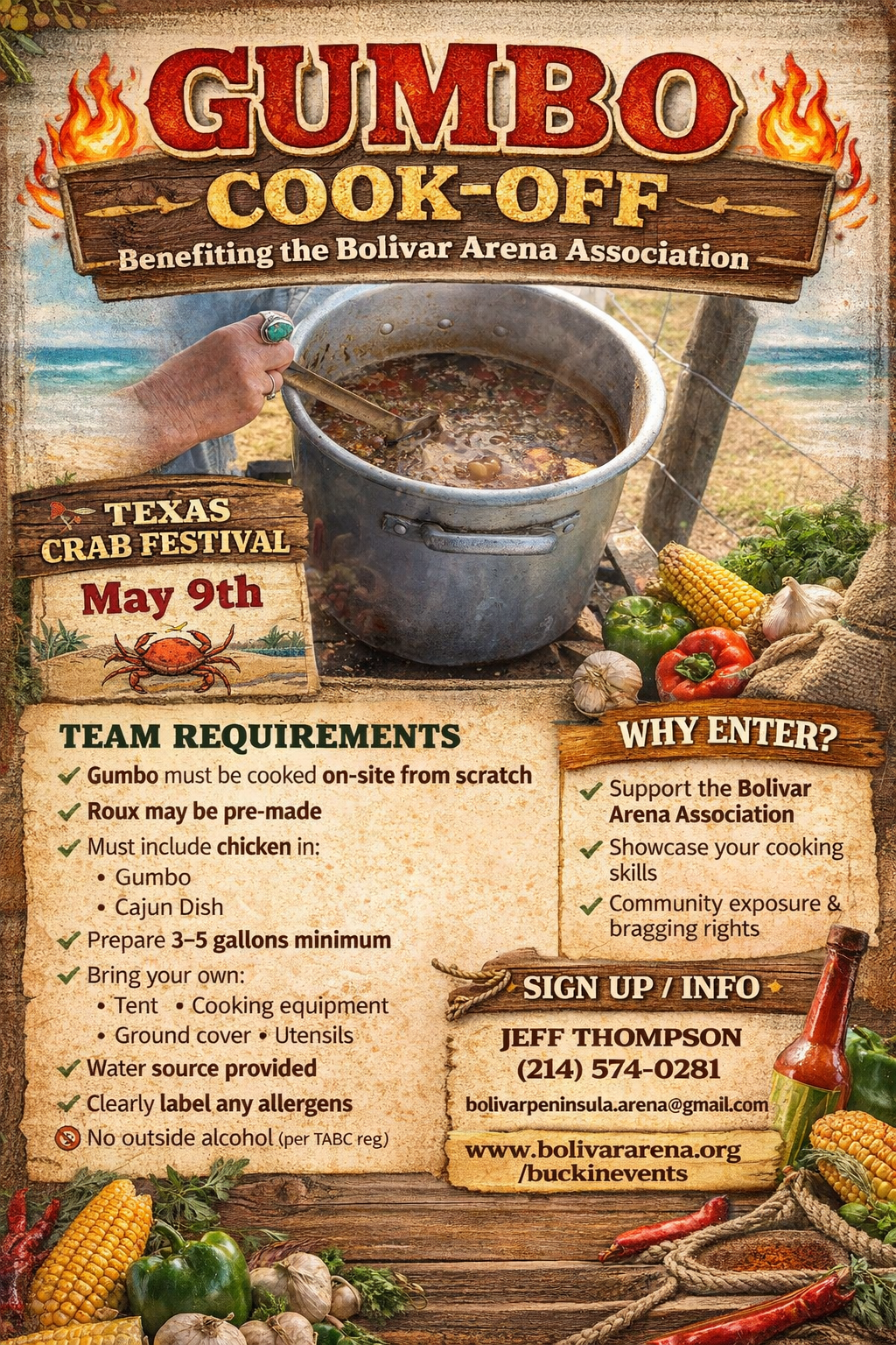 It takes place on Saturday, May 9, 2026, at Swedes Park Pavillion in Crystal Beach, TX, featuring top-tier crab gumbo, cash prizes, and the popular People's Choice Award.